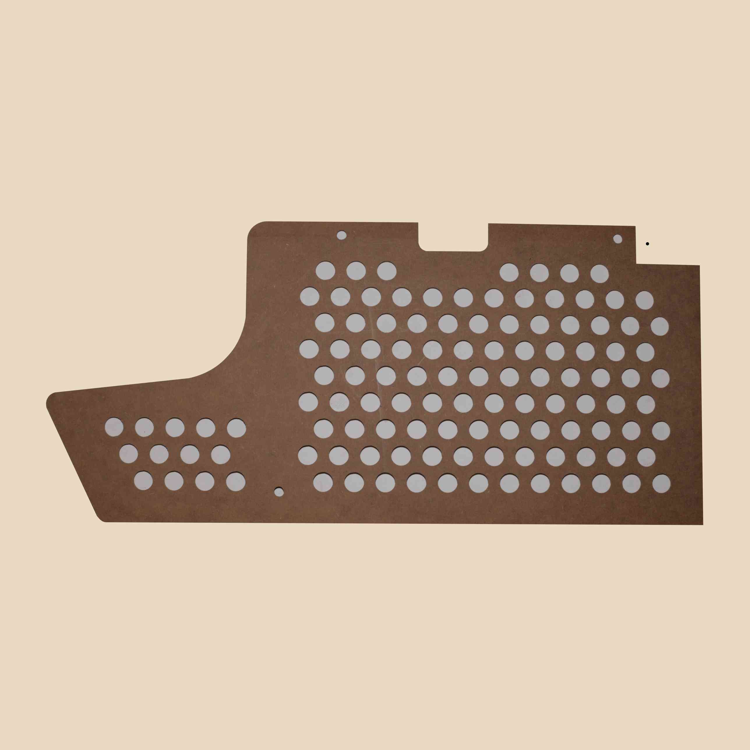 1 Stück Motorraum Verkleidung links, Motorraumhimmel, HDF roh für VW T2b von 8/71 bis 79 mit Reserveradmulde, also für Busse mit Mitteldurchgang oder ab 77 ohne Trennwand. Dort steht der Reservereifen im Gepäckraum links in der Reserveradmulde.